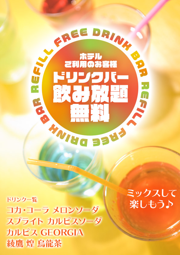 【ホテルご利用のお客様ドリンクバー無料!】 ホテルご利用のお客様は、一階ロビーにありますドリンクバー飲み放題を無料でご利用可能です! コカ・コーラ、メロンソーダ、GEORGIA、綾鷹 等。 ご自由にお召し上がりくださいませ!